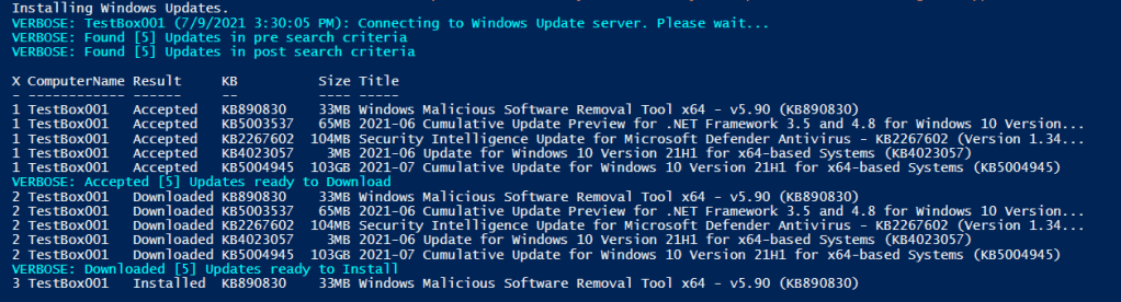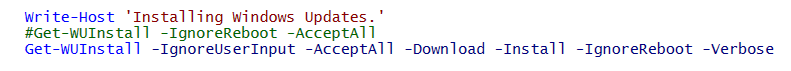 It just displayed the updates and rebooted. Well, maybe it did install? I checked the update history on the VM and it was empty. It also displayed those updates to be installed. Curious, I went to the PowerShell file in the packages folder C:\Packages\Plugins\Microsoft.Compute.CustomScriptExtension\1.10.12\Downloads\4\PublicRepo\master\0b7a713c381a8cbecf04f92122d1c0b07324871e\Artifacts\windows-install-windows-updates\scripts\artifact.ps1 and saw the cmdlet:
